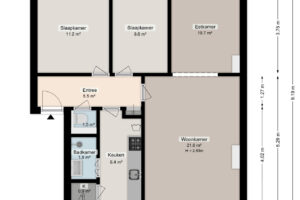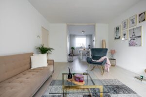 Woonkamer: De L-vormige woonkamer van 32m² biedt voldoende ruimte voor een gezellige zithoek (21m²) en eethoek (11m²), met veel natuurlijk licht door de grote ramen.