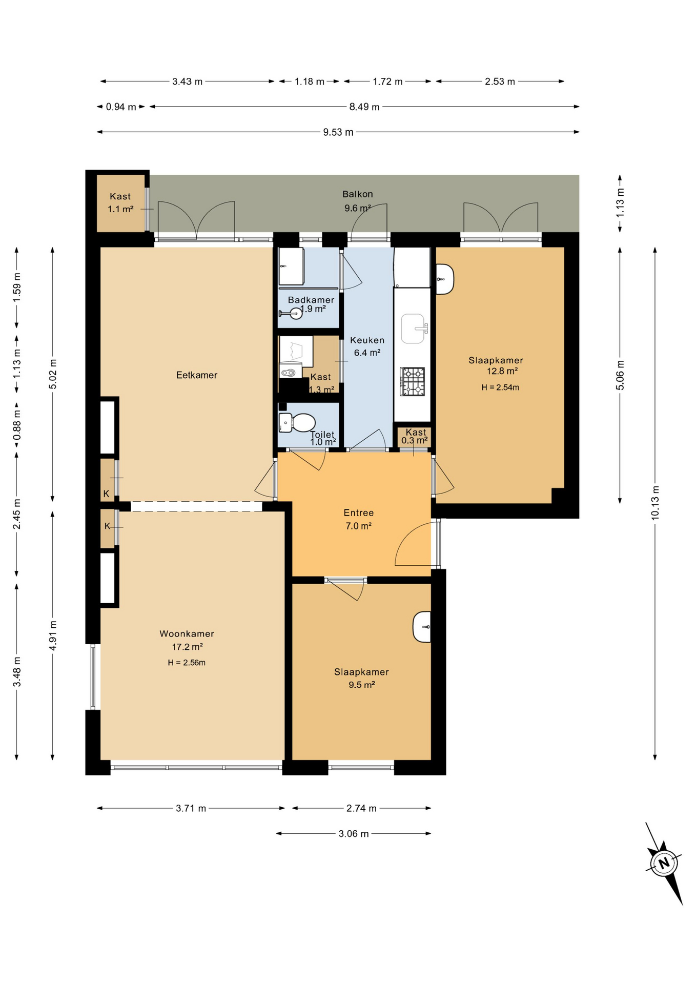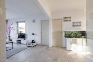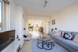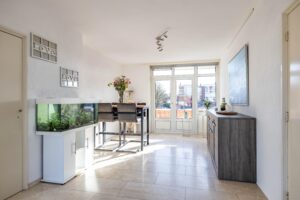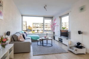 De ruime en lichte woonkamer van circa 17 m² vormt het hart van het appartement. Dankzij de openslaande deuren heb je direct toegang tot het royale balkon van maar liefst 8 meter breed, gelegen op het zonnige zuiden. Een heerlijke plek om van de zon en het levendige uitzicht te genieten.