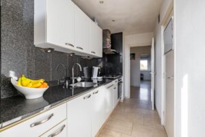 De moderne keuken van circa 6 m² is praktisch ingericht en voorzien van diverse inbouwapparatuur, waaronder een 5-pits gasfornuis, oven, vaatwasser en afzuigkap. Ideaal voor wie graag kookt.
