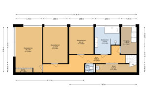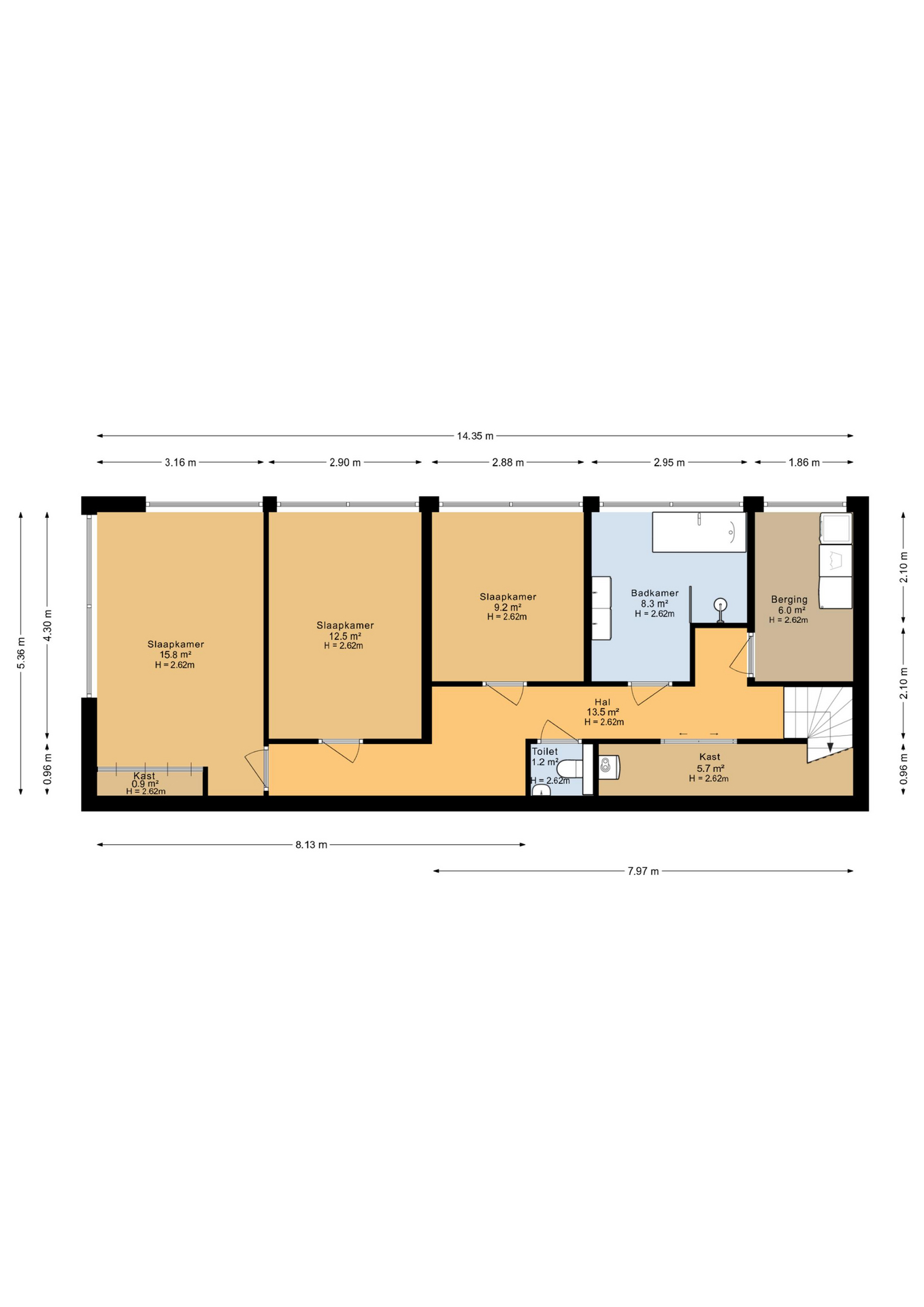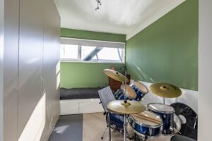 Op de benedenverdieping bevinden zich drie ruime slaapkamers, waaronder een royale master bedroom van circa 16m², en 2 slaapkamers van circa 13m² en 9m² en een complete badkamer van circa 8m² met ligbad, inloopdouche en dubbele wastafel. Daarnaast is er een praktische inpandige berging van ca. 7m² en voldoende kastruimte.