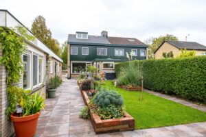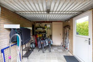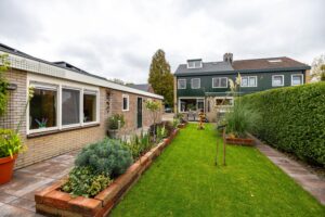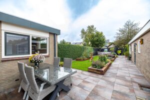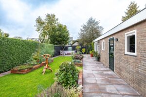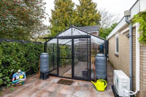 De achtertuin is gelegen op het noorden en biedt volop ruimte om te ontspannen, spelen of om te tuinieren in de aanwezige broeikas(13m²). Dankzij de slimme indeling vindt u er zowel zon als schaduwplekken. Aan de voorzijde is in 2022 een nieuwe, onderhoudsvriendelijke voortuin aangelegd die het huis een verzorgde uitstraling geeft. Vanuit de tuin heeft u direct toegang tot de garages en het bijgebouw.