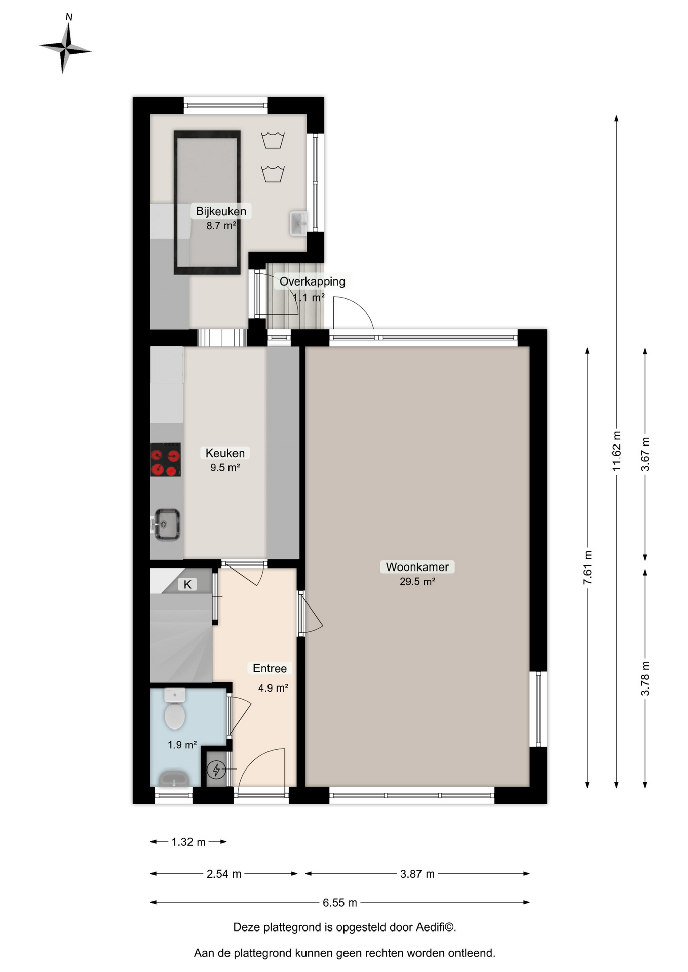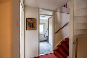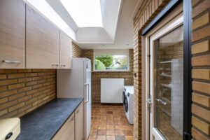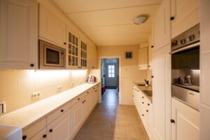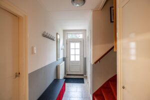 Via de nette voortuin bereikt u de entree(5m²) van de woning. In de hal vindt u het toilet(2m²), de meterkast, trapopgang, trapkast en toegang tot de ruime woonkamer(30m²). Dankzij de grote raampartijen en tuindeuren geniet u hier van veel lichtinval én direct tuincontact. De keuken(10m²) is voorzien van diverse inbouwapparatuur, waaronder een inductiekookplaat, oven, magnetron, vaatwasser, koel-vriescombinatie en een close-in boiler. Aansluitend vindt u de praktische bijkeuken(9m²) met witgoedaansluitingen en toegang tot de tuin.