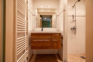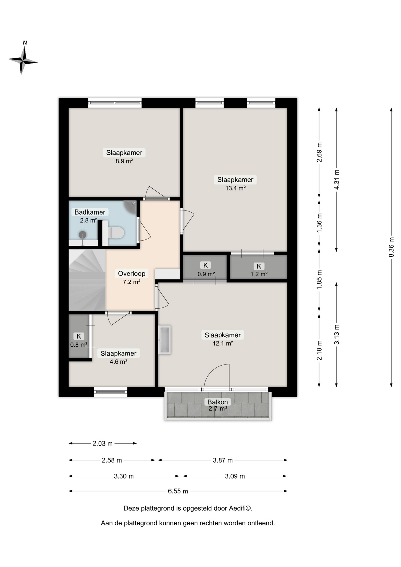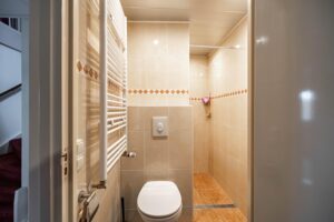 Op de eerste verdieping bevinden zich vier slaapkamers(5m², 9m², 12m² en 13m²) en een verzorgde badkamer(3m²) met douche, toilet en vaste wastafel.