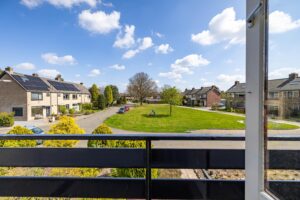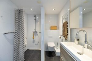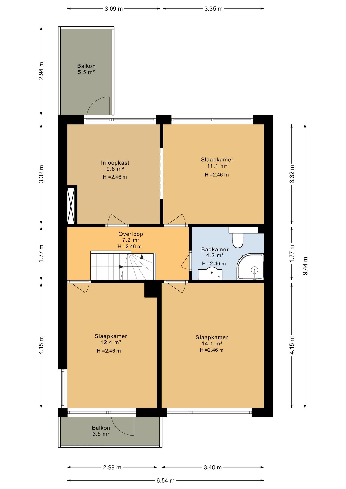 Overloop, 4 slaapkamers resp. 7m2 9m2, 5m2 en 12 m2 met balkon en een moderne badkamer voorzien van douche, toilet en wastafel.