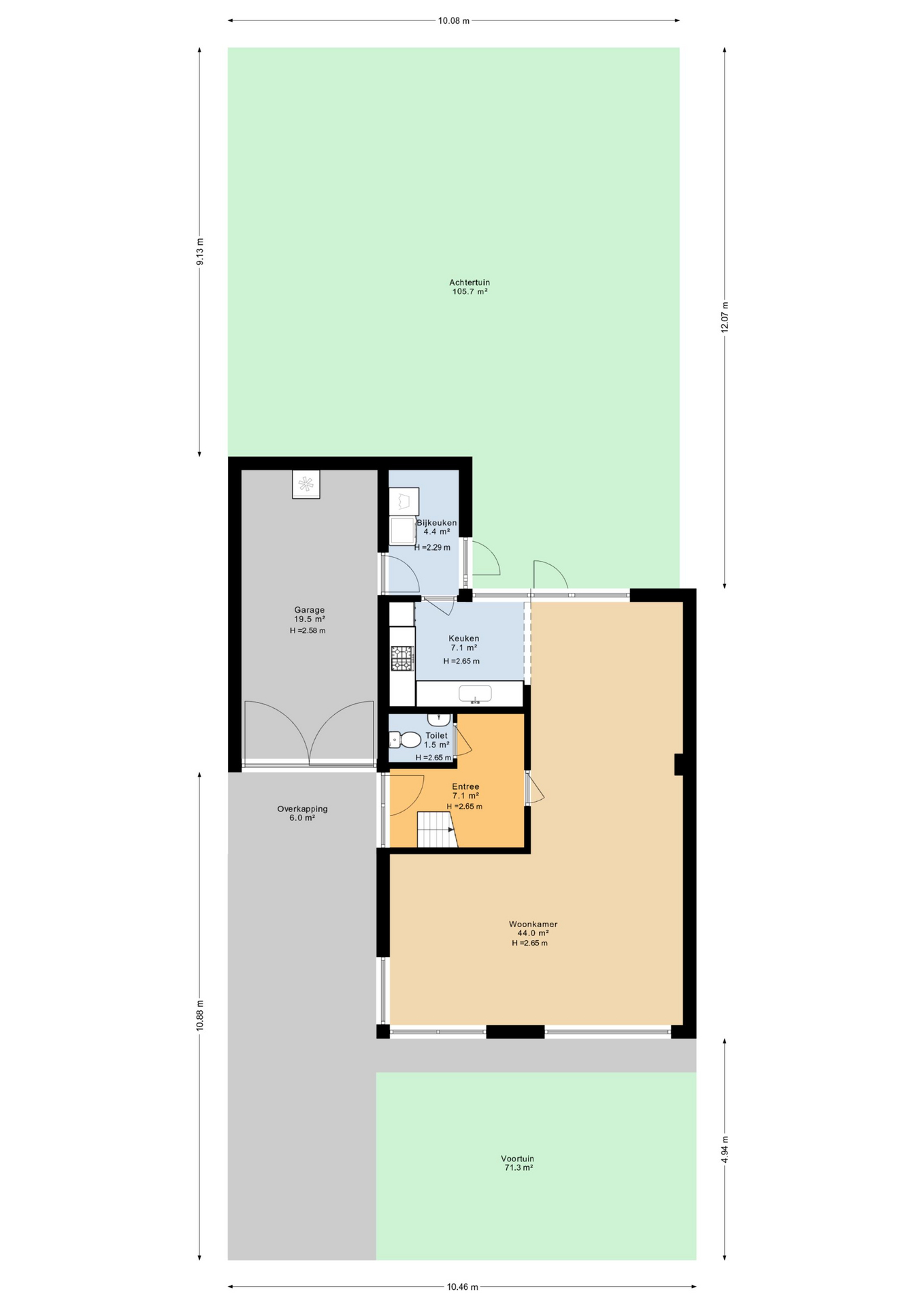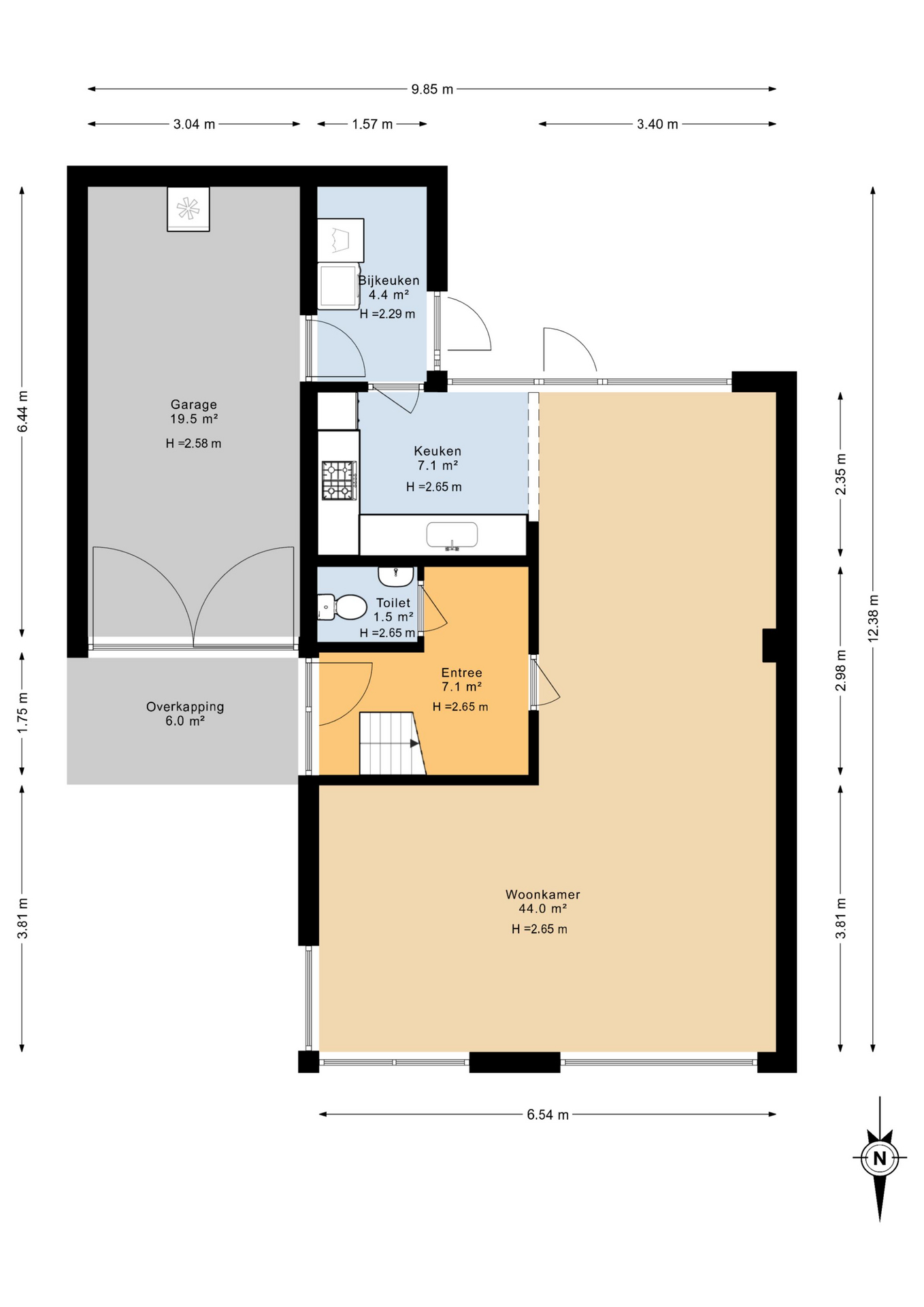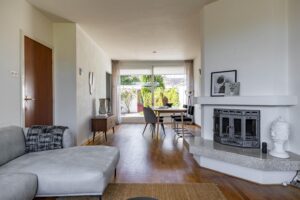 Hal/entree, toilet met fonteintje, woonkamer ± 31 m2 voorzien van open haard en schuifpui naar de zonnige achtertuin welke op het westen ligt. Vanuit de woonkamer kom je in de half open keuken met eenvoudig keukenblok.