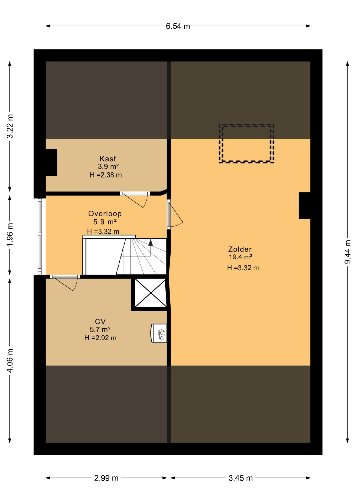 Middels een vaste trap bereikt men de overloop/berging waar de 5e slaapkamer zich bevindt.